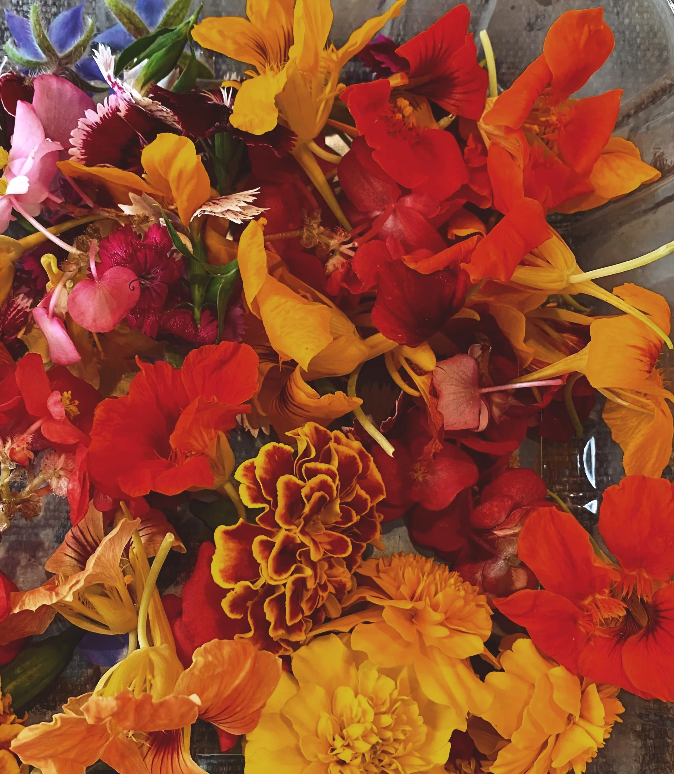 Disclaimer : not all flowers in photos are edible. The only edible flowers are placed directly on the box/cups. Extra foliage are used for decorative purposes only.
